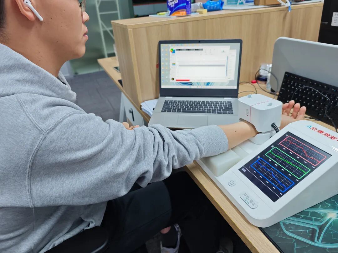 在实践教学中,同学们在跟诊中同步使用传统指法与仪器检测,通过对比指感与客观数据,实时校准自身感知,顺利完成从理论到实践的精准过渡。此外,大家还可以操作仪器调取关联患者脉象、病史与诊断的完整病例库,通过分析“脉-证-病”一体化数据,训练“识脉辨证”的临床推理能力。